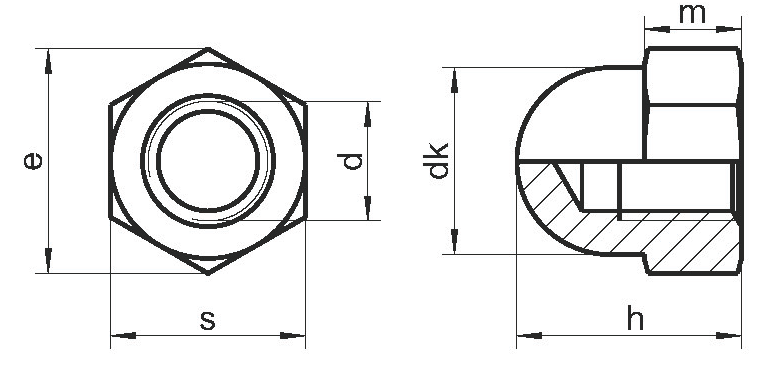 Гайки колпачковые DIN 1587 высокие в отличие от стандартных имеют сферический колпачок высотой 7 – 52 мм, при диаметре внутренней резьбы: М3 – М30 мм. Нижняя часть изделия выполнена в виде классического шестигранника с шириной по граням от 5,5 до 46 мм, что позволяет производить надежное завинчивание с применением накидных или рожковых ключей, а также автоматических гайковертов с контролем затягивающего момента.
