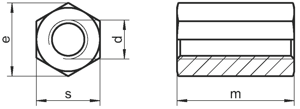 Гайки шестигранные высокие DIN 6334 высота = 3xd – так называемые шестигранные резьбовые муфты. Применяют в качестве соединительного элемента при наращивании и удлинении резьбовых изделий: шпилек, болтов, штифтов или анкеров с резьбой. Имеют широкую область применения, в основном в машиностроении и станкостроительной промышленности, часто в высотном строительстве при использовании современных сверхпрочных конструкций. Согласно нормативам DIN и ГОСТ длина соединительной резьбовой муфты равна трем ее внутренним диаметрам. В данном случае, представлена линейка изделий с диаметром внутренней резьбы от М5 до М30 и высотой корпуса, соответственно, от 15 до 90 мм. При этом внешние размеры по плоскостям составляют 8-46 мм, а по граням 8,79-51,28 мм.