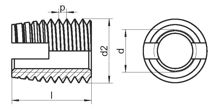 Самонарезающие метизы ART 9058 из-за особенности формы имеют разные номинальные внутренний (d) и внешний (d2) диаметры. Ассортимент резьбовых вставок представлен изделиями длиной от 6 мм до 27 мм, с вариаций сечений от М3х0,5/М5 до М20х1,5/М26.