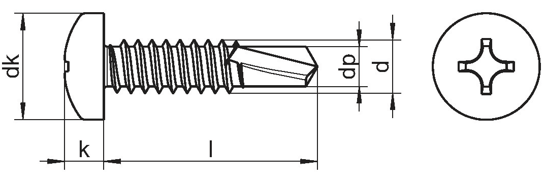 Винты самонарезающие сверлоконечные, форма М DIN 7504 M H полукруглая головка, крестообразный шлиц Ph (Phillips) – крепеж имеет ряд конструктивных особенностей, которые облегчают его использование. Наличие сверла на конце изделия позволяет производить крепление листовой стали толщиной до 0,9* мм к металлическому основанию толщиной до 4* мм без предварительного сверления. Крепление элементов из любого материала к металлической основе толщиной более 6 мм производится с обязательным предварительным сверлением отверстия соответствующего диаметра.
