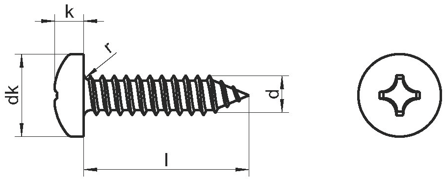 Метиз состоит из полукруглой головки с крестовым шлицом и стержня с плотной однозаходной резьбой. На конце резьбы нержавеющий саморез заострён. Диаметр резьбы 3,9 мм. Длина винтов предлагается от 9,5 мм до 45 мм.