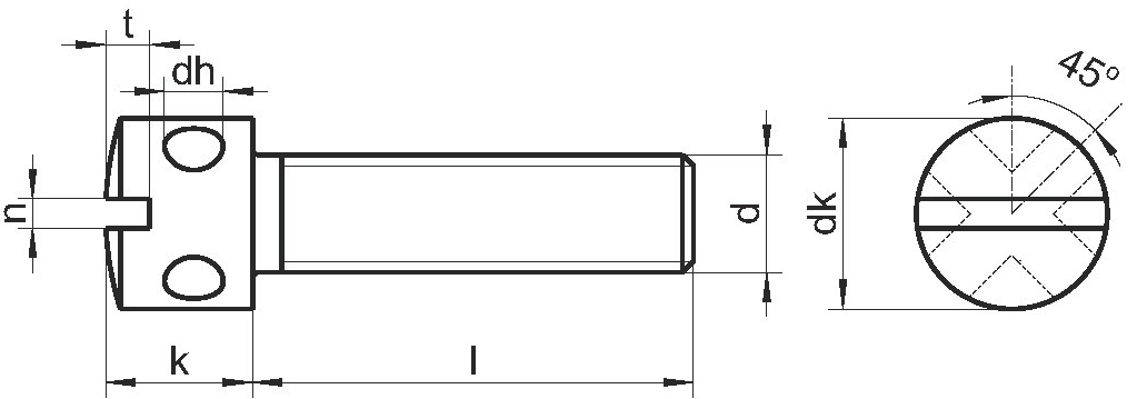 Конструкция крепежных изделий DIN 404 представляет собой цилиндрический стержень с неполной метрической резьбой, монолитно соединенный с высокой цилиндрической головкой (высота до 3мм). Которая имеет глубокий прямой шлиц и два сквозными отверстиями. Отверстия образуют радиальные оси, невправленные крестообразно относительно друг друга, которые формируют угол 45 градусов относительно линии шлица. Основным предназначением отверстий является установка контрольных пломб, поэтому подобные метизы часто называются – «пломбировочными».