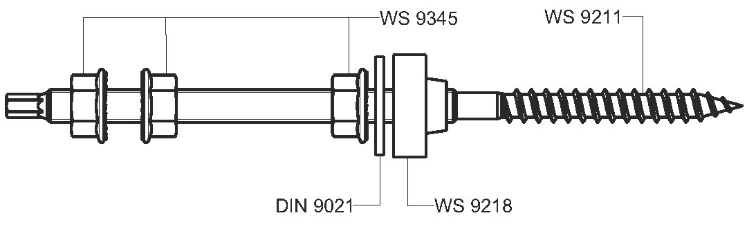 Винт с метрической и шурупной резьбой WS 9217 (двурезьбовая шпилька, дюбель-винт или комбинированный винт-шуруп) состоит из длинного металлического стержня с нанесенной разнотипной резьбой. Меньшая часть стержня представлена шурупной резьбой под дюбель, на большей части – выполнена полная метрическая резьба, в начале которой выполнен шестигранный хвостовик для захвата ключом или специальной битой. Эта головка значительно облегчает завинчивание данного винта-шурупа в дюбель соответствующего диаметра. Также для этой цели допускается использовать одну из трех шестигранных самоконтрящихся гаек с зубцами WS 9345, расположенной на метрической резьбе. Герметизацию крепёжного узла в бетон или кирпичную кладку обеспечивает уплотнительная резиновая шайба из синтетического каучука, EPDM.