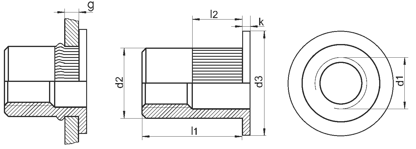 Применение: Предназначены для создания неразъемного соединения тонколистовых материалов, а также для образования соеденяемых листовых материалах элемента крепления с внутренней (заклепка-гайка) или наружной (заклепка-болт) метрической резьбой.