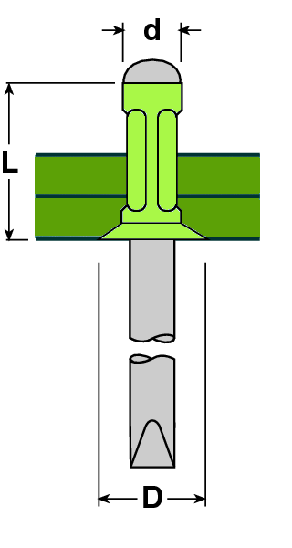 d | L | D | Диаметр сверления отверстия | Толщина соединяемого материала мин/макс | Нагрузка на разрыв | Нагрузка на срез |