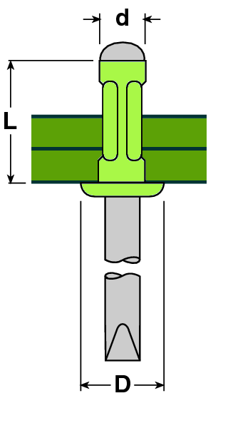 d | L | D | Диаметр сверления отверстия | Толщина соединяемого материала мин/макс | Нагрузка на разрыв | Нагрузка на срез |