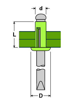 d | L | D | Диаметр сверления отверстия | Толщина соединяемого материала мин/макс | Нагрузка на разрыв | Нагрузка на срез |