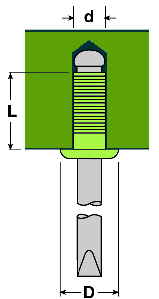 d | L | D | Диаметр сверления отверстия | Толщина соединяемого материала мин/макс | Нагрузка на разрыв | Нагрузка на срез |