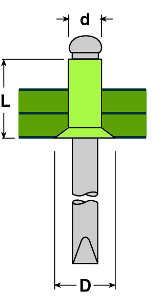 d | L | D | Диаметр сверления отверстия, мм | Толщина соединяемого материала мин/макс, мм | Нагрузка на разрыв, Н | Нагрузка на срез, Н |